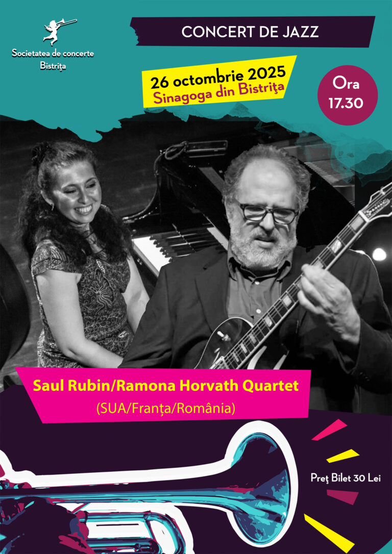 Societatea de Concerte Bistrița vă invită duminică 26 octombrie 2025, ora 17:30, la Sinagoga Bistrița  CONCERT DE JAZZ Saul Rubin / Ramona Horvath Quartet Jazz de excepție în interpretarea unor artiști internaționali. ( SUA / Franța / România ) Preț bilet…