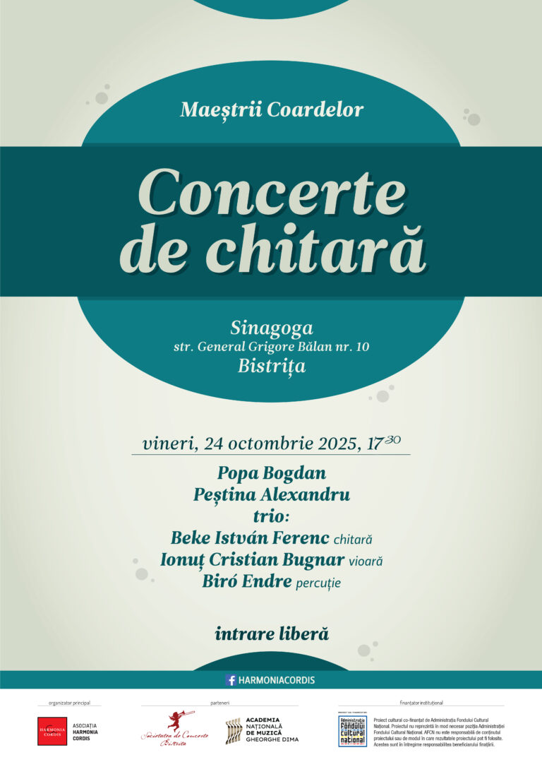 În cadrul stagiunii muzicale permanente, vă invităm vineri 30 mai 2025, ora 19.00, mai la un Concert Cameral cu Cvartetul Tiberius, la Sinagogă.  Organizatori: Centrul Cultural Municipal George Coşbuc şi Primăria Municipiului Bistriţa  Componenţa Cvartetului Tiberius: În program:   W.A.Mozart „Cvartetul…