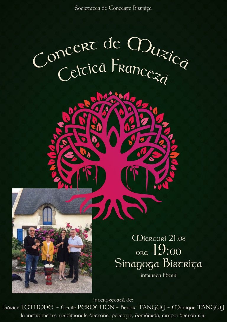 Societatea de Concerte Bistrițavă invită miercuri 21 august 2019 la Sinagoga Bistrița la Concert de muzică celtică franceză interpreteazăFabrice LothodeCecile PerochonBenoit TanguyMonique Tanguyla instrumente tradiționale bretone: percuție, bombardă, cimpoi breton, ș.a. Intrarea este liberă! Vă așteptăm cu drag!