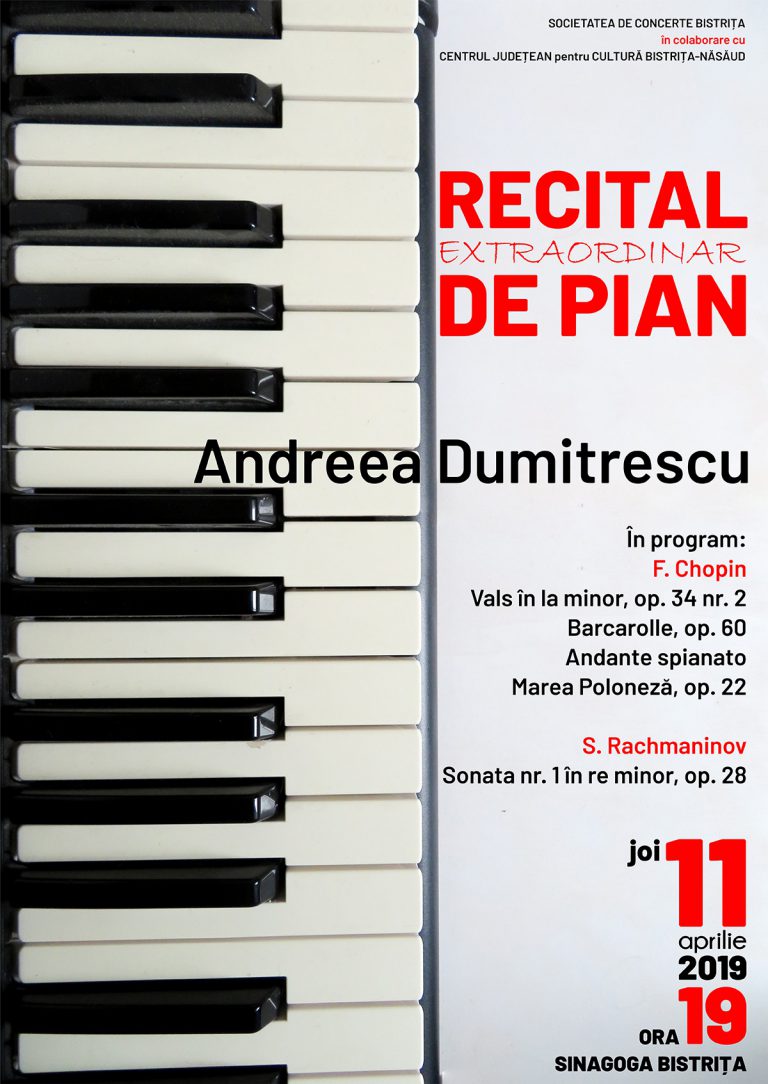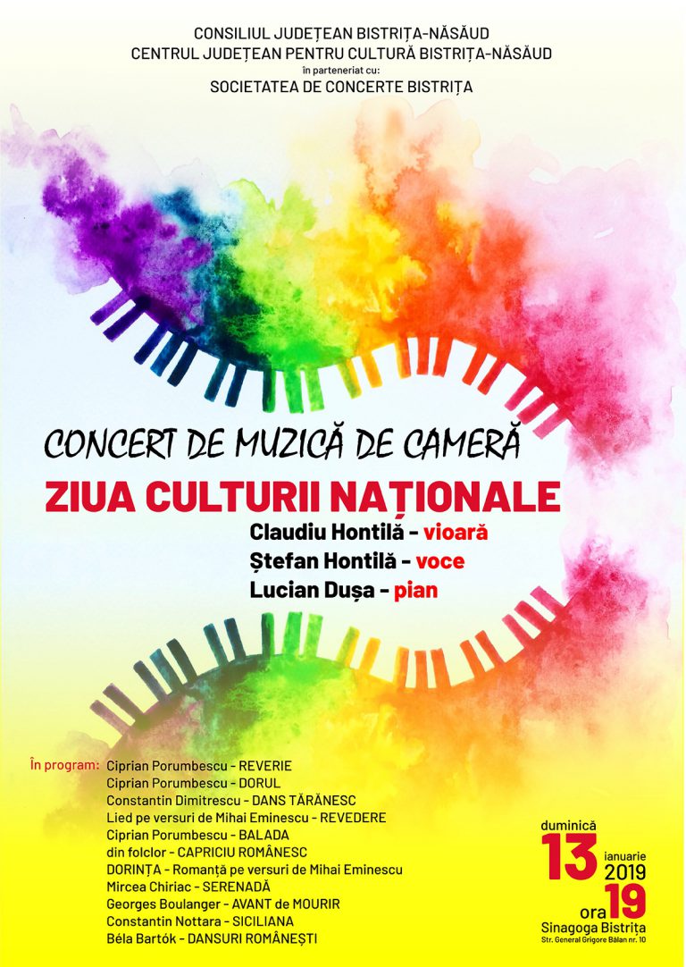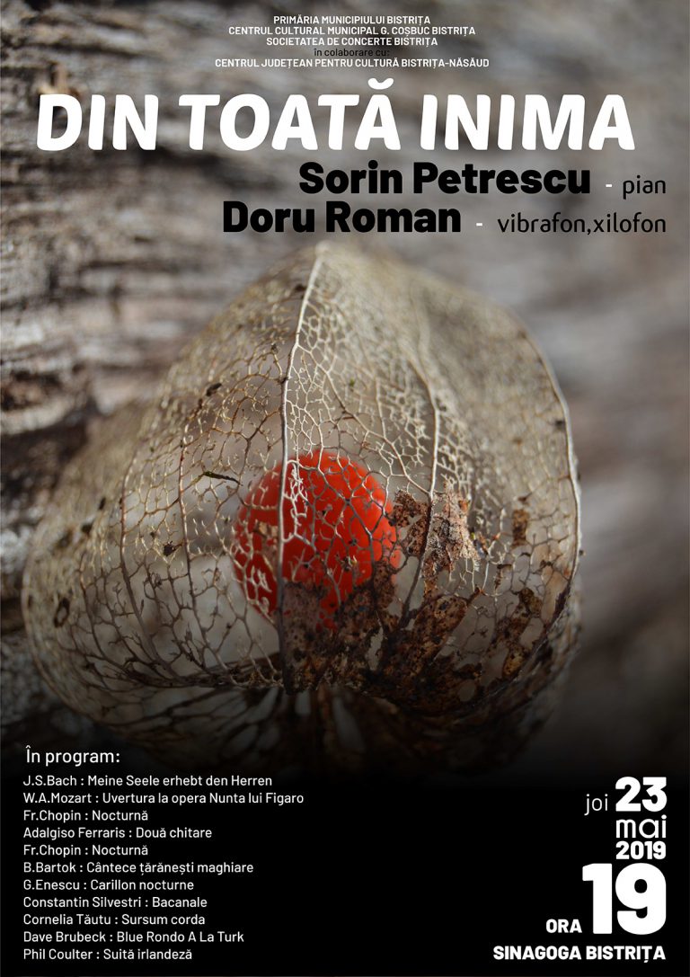 PRIMĂRIA MUNICIPIULUI BISTRIȚACENTRUL CULTURAL MUNICIPAL G. COȘBUC BISTRIȚASOCIETATEA DE CONCERTE BISTRIȚAîn colaborare cu:CENTRUL JUDEȚEAN PENTRU CULTURĂ BISTRIȚA-NĂSĂUD DIN TOATĂ INIMA Sorin Petrescu – pianDoru Roman – vibrafon, xilofon În program : J.S. Bach : Meine Seele erhebt den HerrenW.A.Mozart :…