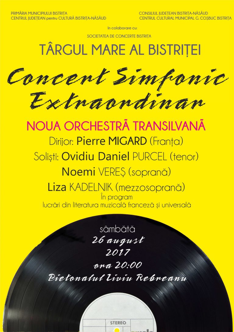 Primăria Municipiului Bistrița Consiliul Județean Bistrița-Năsăud Centrul Cultural Municipal „George Coșbuc” Centrul Județean pentru Cultură Bistrița-Năsăud în colaborare cu Societatea de Concerte Bistrița prezintă în cadrul festivităților Târgul Mare al Bistriței un concert simfonic extraordinar susținut de NOUA ORCHESTRÃ TRANSILVANÃ…