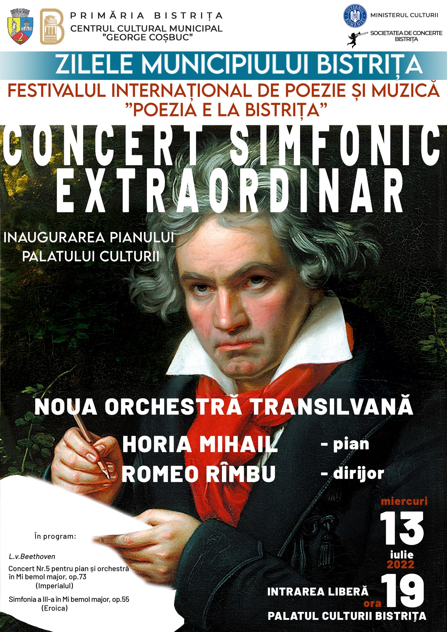 Primăria Municipiului Bistrița și Centrul Cultural Municipal ”George Coșbuc” vă invită, miercuri 13 iulie 2022 de la ora 19:00, la Palatul Culturii unde va avea loc un concert simfonic extraordinar prilejuit de inaugurarea pianului de concert al Centrul Cultural Municipal Bistrița. Concertul se înscrie în suita de evenimente ale proiectului ”Zilele Bistriței”, organizate de Primăria Bistrița și Centrul Cultural și a Festivalului Internațional de Poezie și Muzică ”Poezia e la Bistrița”.
